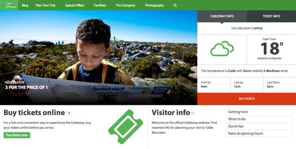 The site has seen a steady increase in online ticket sales over the years, and we've made sure this process remains simple for those who are headed for the cable car. Table Mountain is also one of the New7Wonders of Nature, and so we've made sure that the site highlights this important achievement. Responsible tourism is also very important to the Cableway, and Flow is proud to help promote this. Lastly, the Cableway runs a number of specials throughout the year, including the ever popular Birthday Special and Sunset Special, and it was important to highlight these.